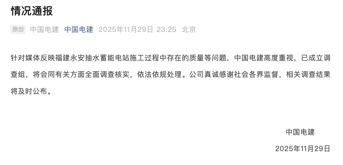 11月29日晚间,中国电建发布情况通报,针对媒体反映福建永安抽水蓄能电站施工过程中存在的质量等问题,中国电建高度重视,已成立调查组,将会同有关方面全面调查核实,依法依规处理。公司真诚感谢社会各界监督,相关调查结果将及时公布。