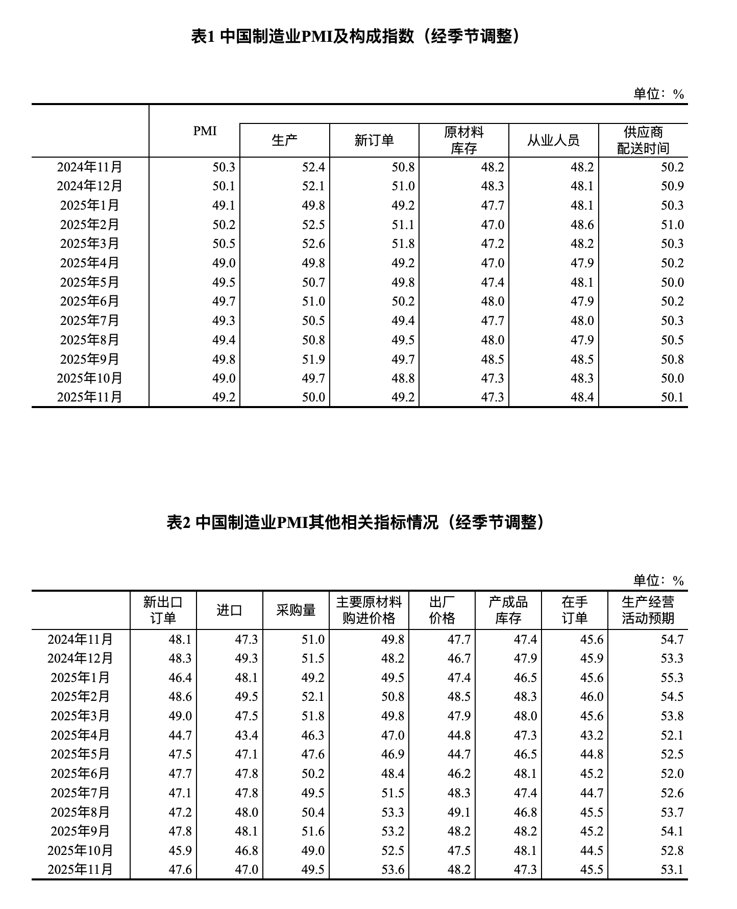 国家统计局公布2025年11月中国采购经理指数运行情况。