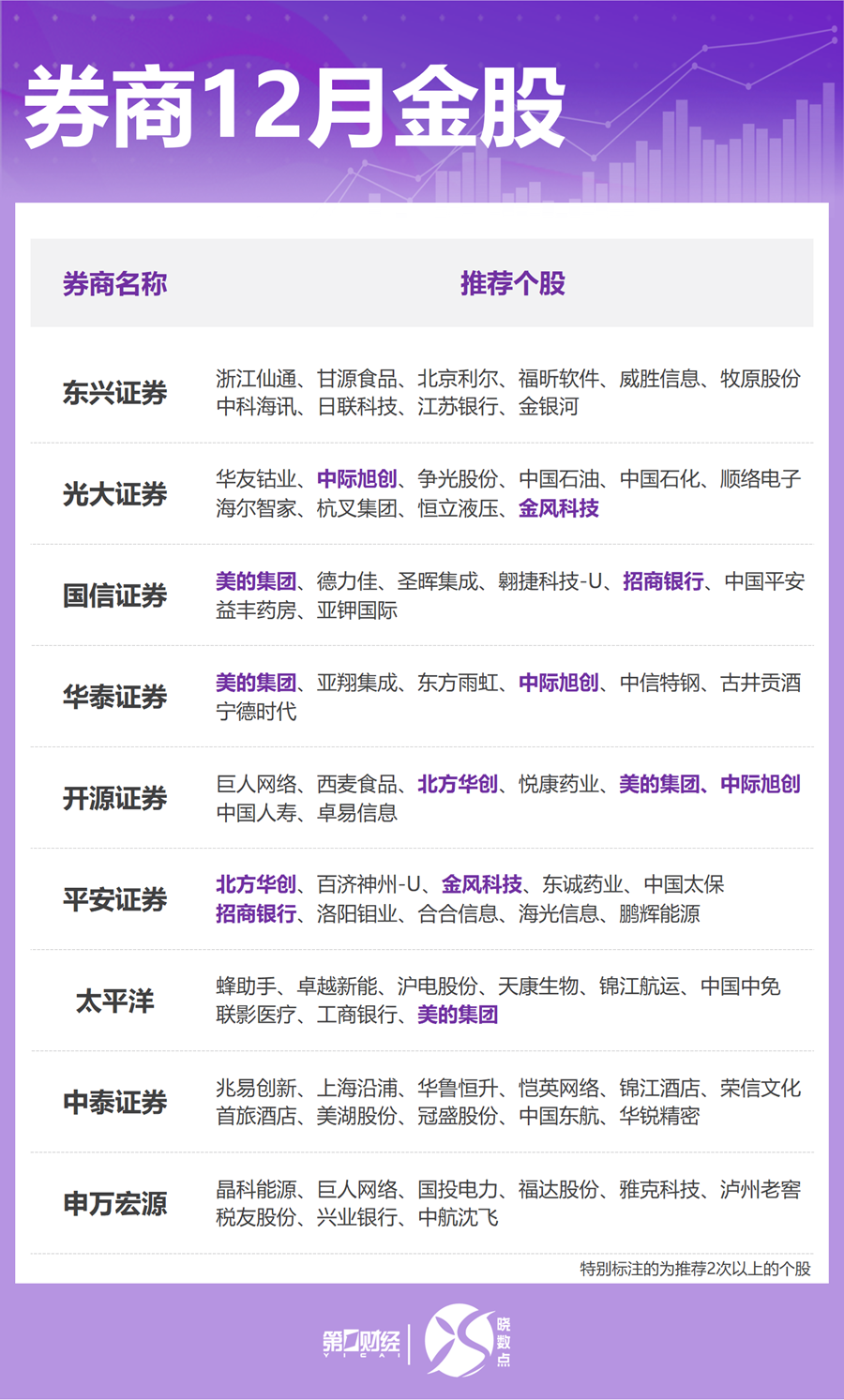据不完全统计,在各家券商的“金股”名单中,获机构推荐次数最多的是美的集团,获得4家券商的推荐,中际旭创获得3家券商的推荐。
