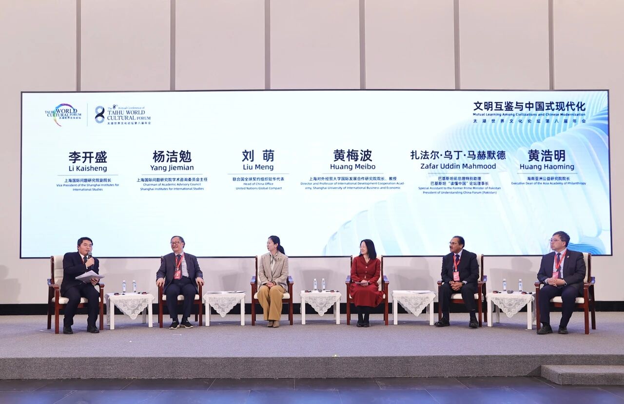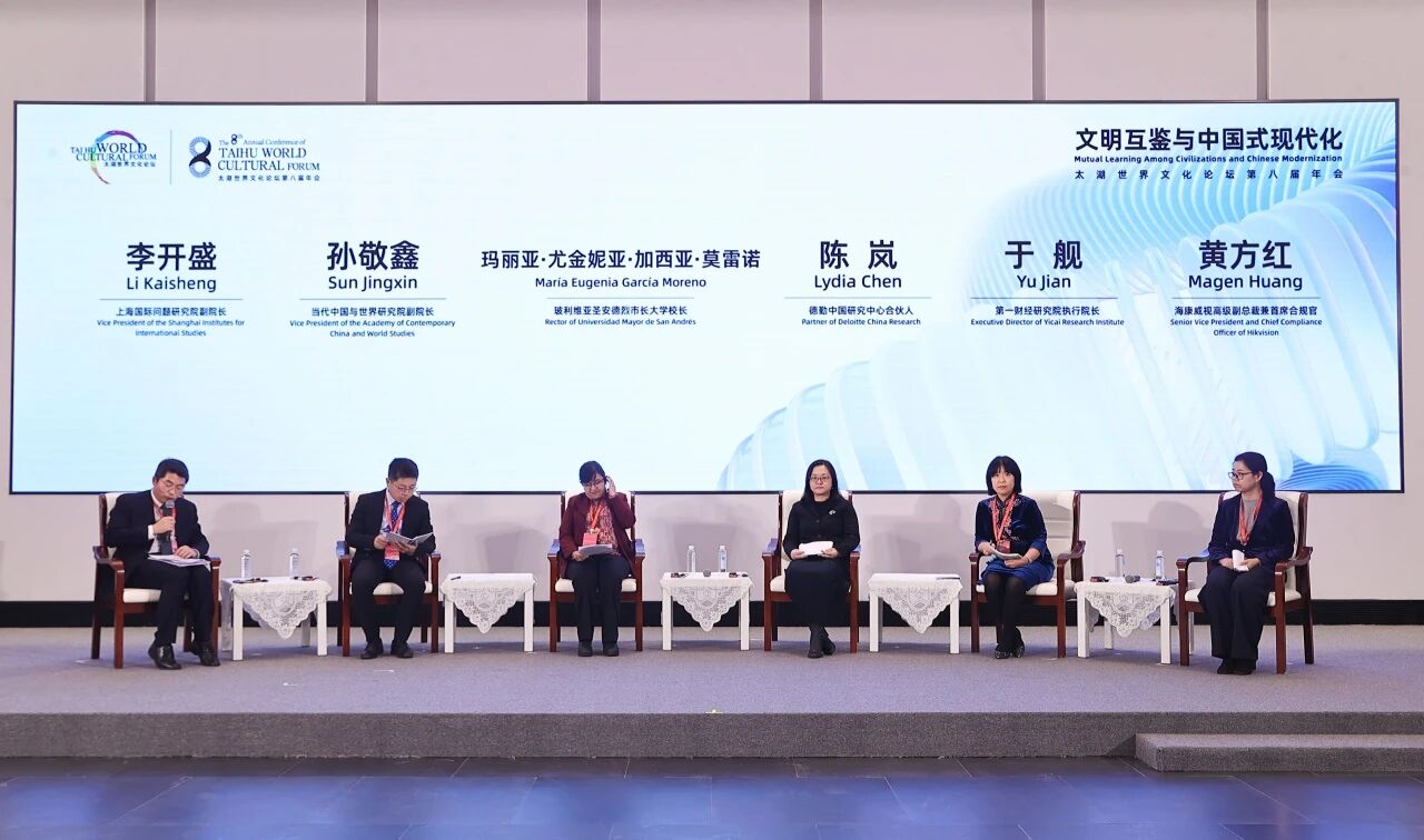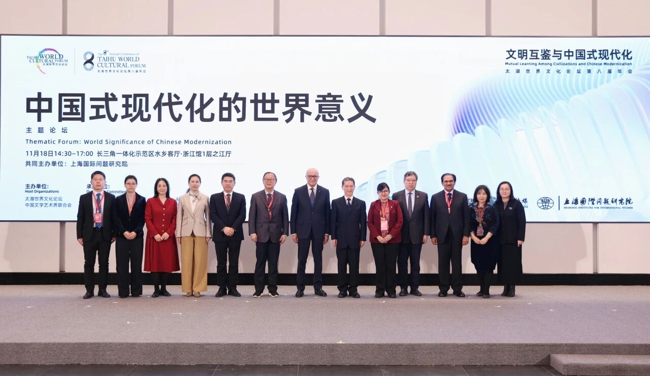 2025年11月18日,由太湖世界文化论坛、中国文学艺术界联合会主办,上海国际问题研究院共同主办的太湖世界文化论坛第八届年会主题论坛“中国式现代化的世界意义”在长三角一体化示范区水乡客厅举办。第一财经研究院执行院长于舰出席论坛并发言。