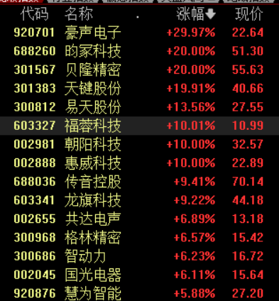 具体来看,消费电子板块集体爆发,AI手机方向领涨,中兴通讯、朝阳科技、福蓉科技等多股涨停。