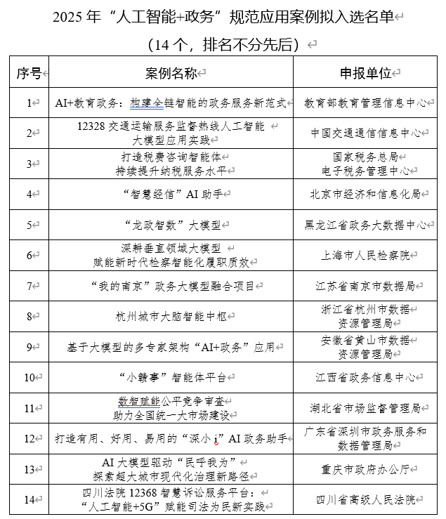 据“网信中国”微信公众号消息,为安全稳妥有序推进人工智能大模型在政务领域应用,在中央网信办信息化发展局指导下,中国网络社会组织联合会面向各级党政机关和事业单位开展2025年“人工智能+政务”规范应用案例征集工作。经组织专家评审,并征求有关单位意见,评选出14个案例。为进一步听取社会各界意见,现将拟入选的2025年“人工智能+政务”规范应用案例名单进行公示。