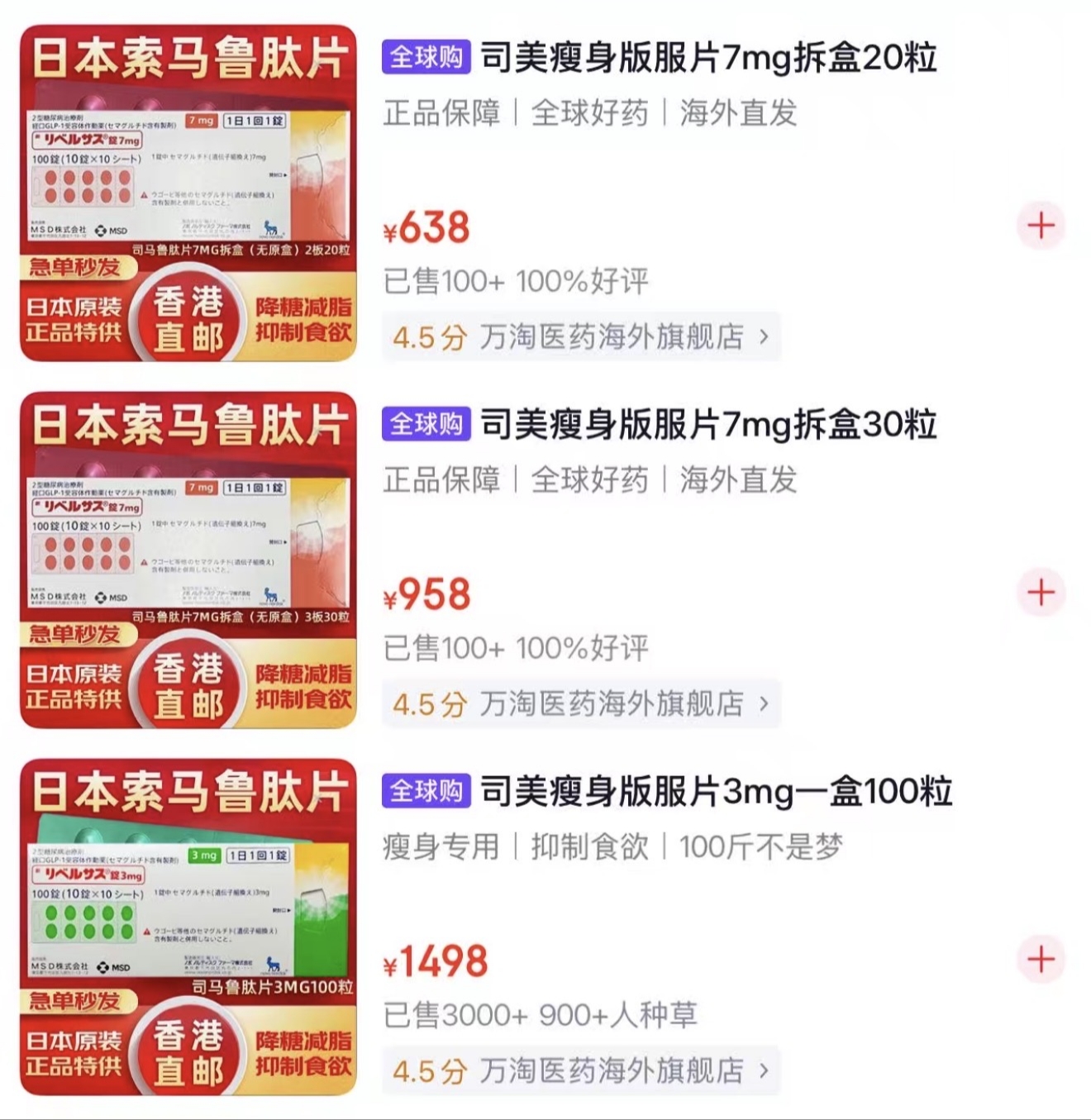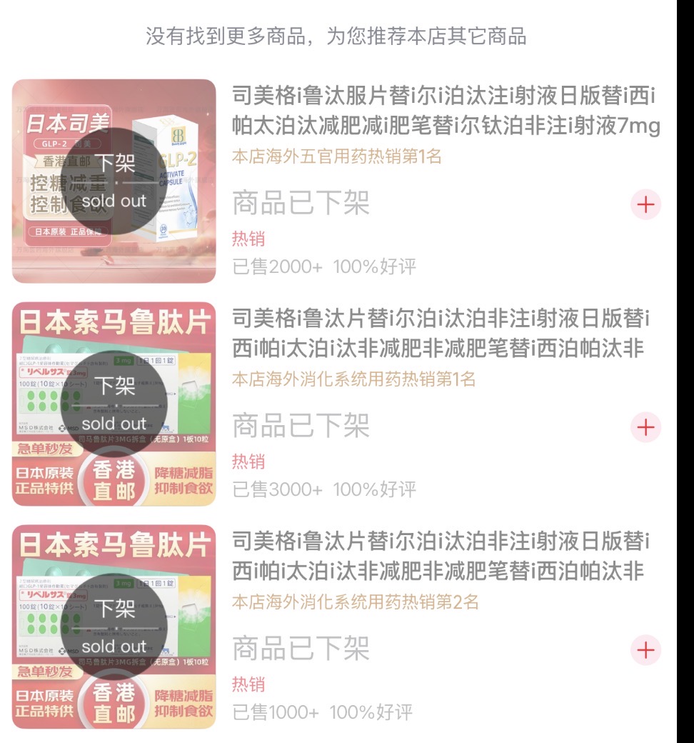 然而,在国内的一些大型电商平台上,充斥着大量打着“口服”“减重”“瘦身”“司美”标签的在售商品。这些商品大部分来自日本,从香港发货。