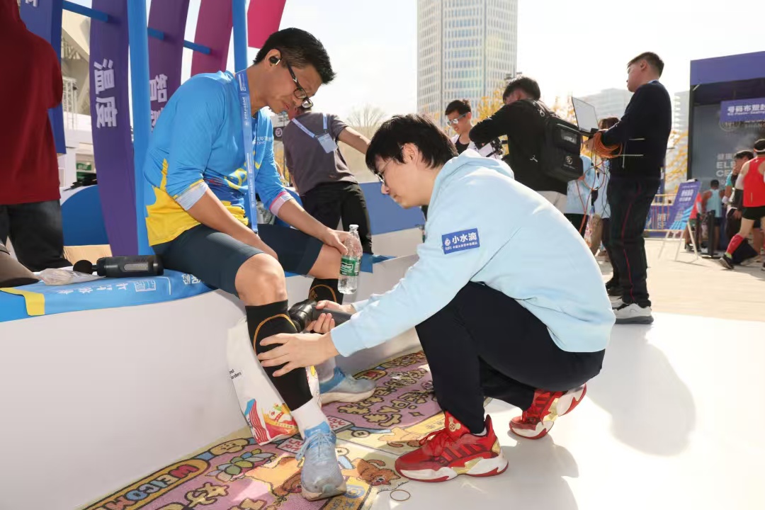 服务,不断创新只为守护热爱。赛前,长江养老精心打造的赛道探秘直播,通过第一视角带领参赛者沉浸式感受赛道全程——从体博会装备领取到定制装备包开箱,从起点至终点的关键地标指引,特邀专业医师在线讲解健康管理知识。直播环节还特别揭秘了中国太保的赛道加油站与终点展台安排,带跑者提前剧透上马精彩。赛事当天,200名太保“小水滴”志愿者在5公里、13公里处设立的加油站以激昂助威为选手注入动力,终点展台的机器狗舞蹈表演、互动抽奖、健康管理服务站和完赛成绩打卡点更为冲线时刻的荣耀纪念。