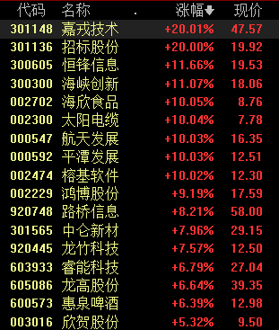 盘面上,福建本地股再度爆发,招标股份、平潭发展等多股涨停。医药商业、海南自贸区、旅游及酒店、AI手机等板块涨幅居前;能源金属、游戏、教育等板块走弱。
