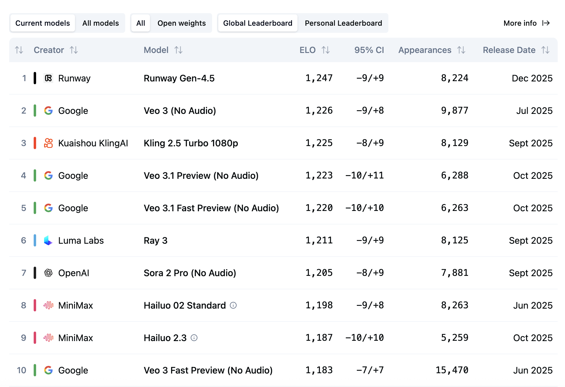 刚刚进入12月,视频生成模型的竞赛又开始了。当地时间12月1日,海外AI视频初创公司Runway正式发布新一代视频模型Gen-4.5,在基准测试中超越谷歌的Veo3登顶。
