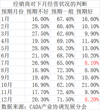 最近一期“中国汽车经销商库存预警指数调查”显示,仅8.2%的汽车经销商预期12月经营状况较好,比上月下降1.7个百分点;预期12月市场不好的比例则从17.7%上升到了20.3%,上升2.6个百分点。