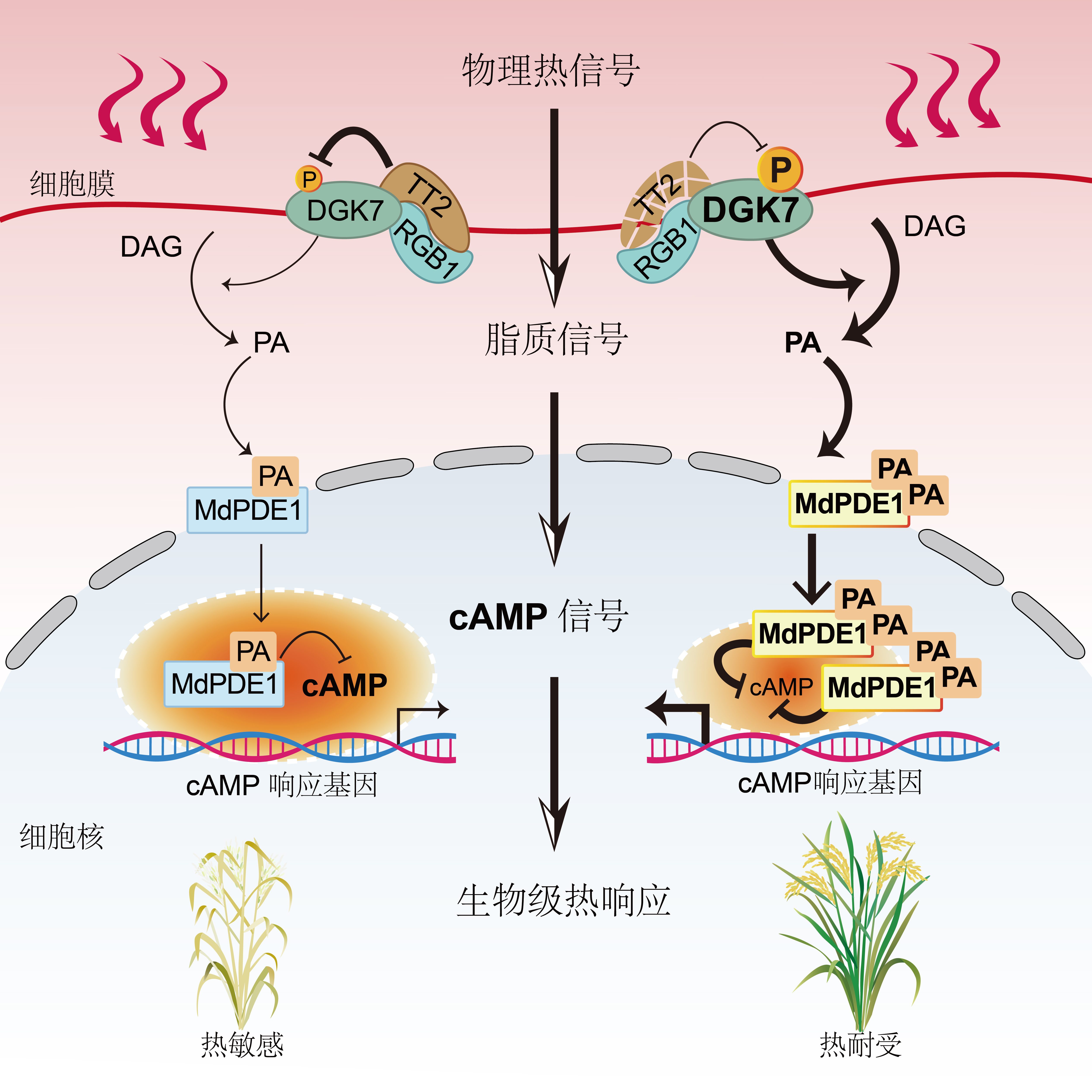 研究团队经过多年努力,成功鉴定到水稻中两个关键调控因子,DGK7(二酰甘油激酶)和MdPDE1(磷酸二酯酶)。它们像一套精密协作的“警报系统” ,将高温物理信号一步步转化为细胞能够理解的“生物指令”,完成一场从细胞边界到细胞核的“传讯”。该发现系统连接了从细胞膜脂质重塑到核内信号级联的完整过程,解决了领域内长期存在的难题。