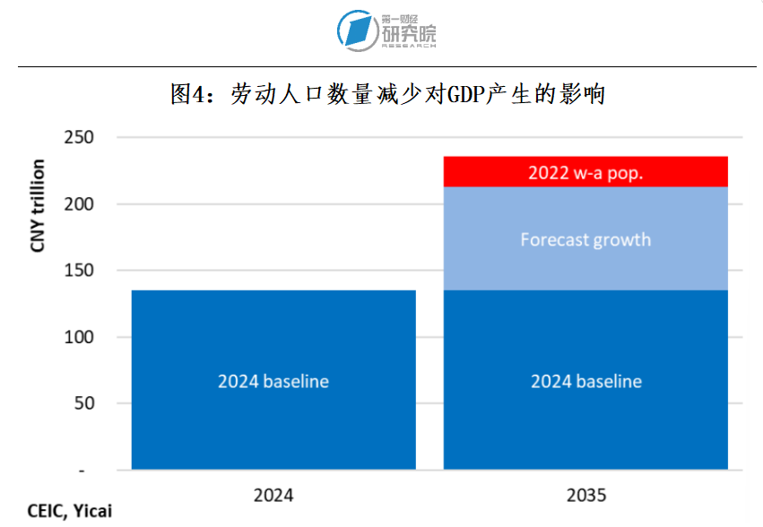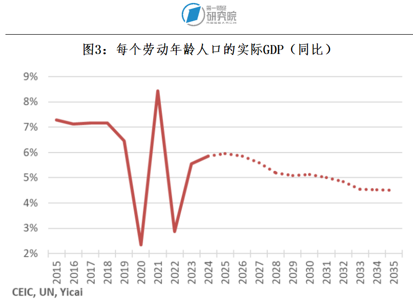 图4显示,2025至2035年年均5%的生产率增长足以抵消劳动年龄人口年均下降0.8%产生的影响。