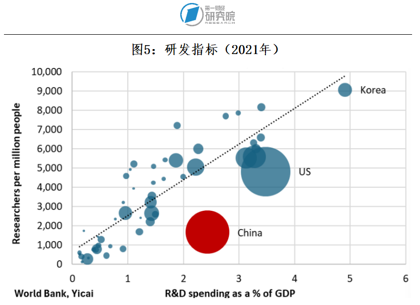 提高人力资本水平至关重要。2021年,中国在研发方面的支出相当于GDP的2.6%,这一比例高于欧盟。然而,与其他经济体相比,就所投入的资金而言,中国的研究人员明显较少(图5)。因此,中国政府提到要增强自身在教育、科技和人才方面的实力。