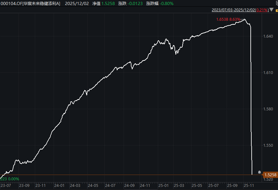从基金净值情况来看,经过此番剧烈调整,目前华宸未来稳健添利A的复权单位净值回落至1.5258元,与2023年7月中旬(7月17日为1.5258元)的水平相当。换言之,这波下跌亏掉了此前近两年半的累计收益。