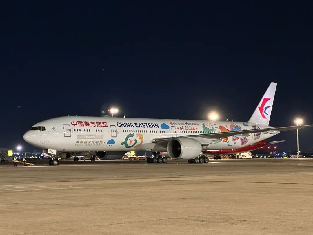 此次首航航班,东航特别选用“国博号”主题彩绘机执飞。这架彩绘机基于波音777-300ER大型宽体客机打造,由中国东航与中国国家博物馆联袂设计,于今年9月正式亮相,被誉为是国博48个标准展厅之外的“第49个展厅”,承载着满满的中华文化元素。