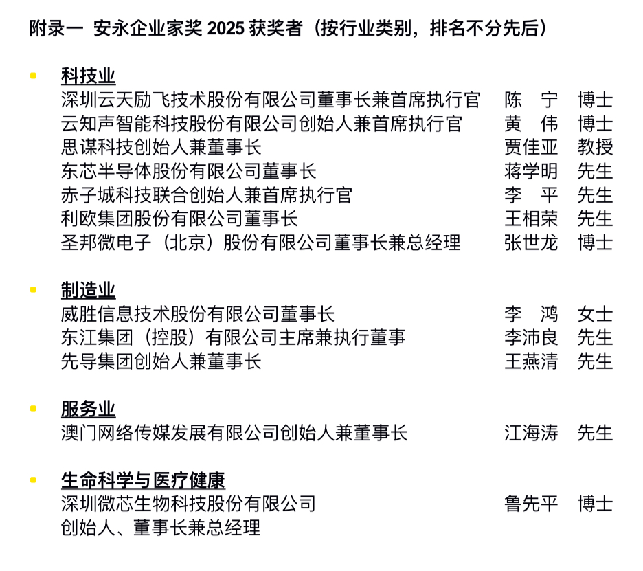 二十届四中全会擘画“十五五”发展蓝图,明确对“加快高水平科技自立自强,引领发展新质生产力”进行专章战略部署,聚焦科技创新领域,彰显国家对民营企业布局新兴和未来产业、开展科技攻关的重视和支持。今年的获奖者中,来自科技行业、生命科学与医疗健康、制造业及服务业的企业家,无一不通过科技赋能,革新产品和营运模式,在创新的道路上筑梦前行。