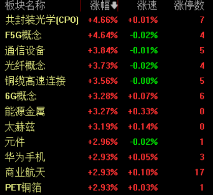 盘面上,题材股多点开花,CPO方向领涨,算力硬件、6G、超硬材料、商业航天、半导体、锂矿、金融科技概念股纷纷走强。煤炭、油气板块走弱。