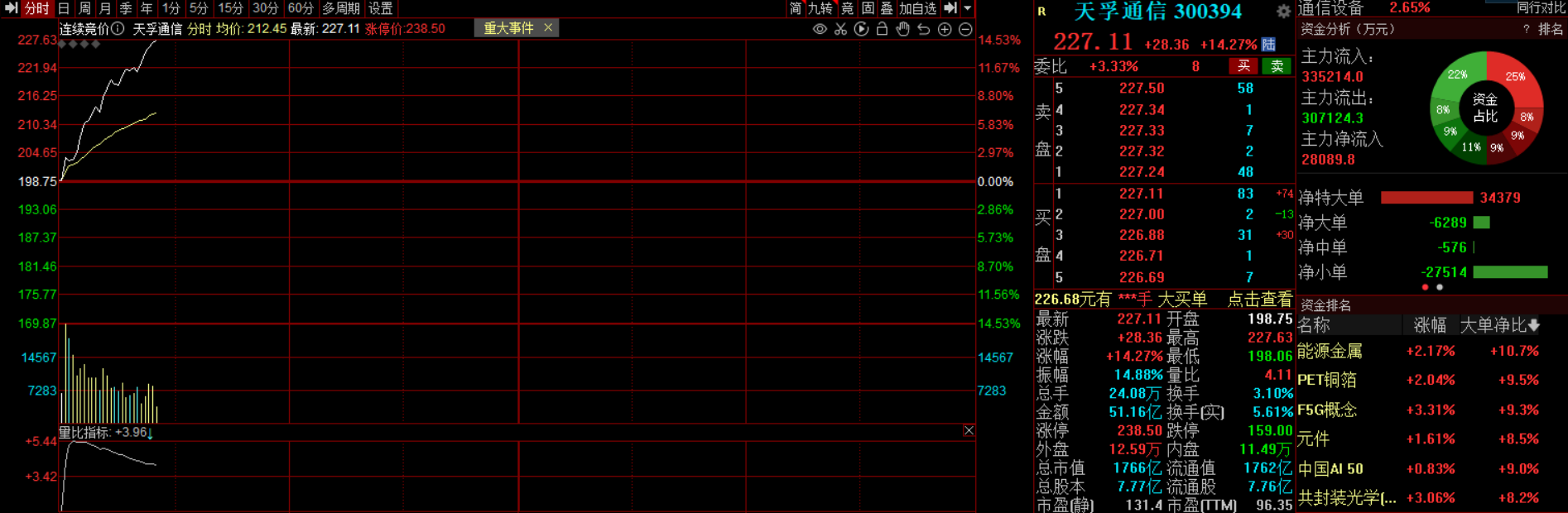 09:55 天孚通信盘中股价创历史新高,现涨超14%,报227.11元,总市值为1766亿元。