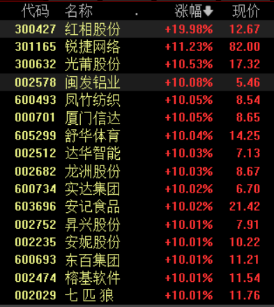 具体来看,福建本地股全线走强,厦门信达、永辉超市、安记食品等超20股涨停。