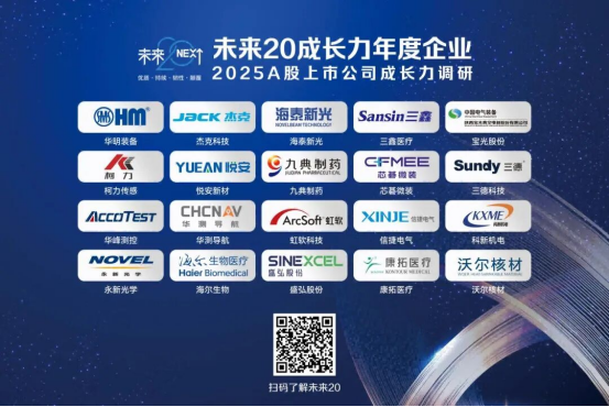 会议期间,“未来20·2025A股上市公司成长力年度企业”名单权威发布。这20家企业分别是华明装备、杰克科技、海泰新光、三鑫医疗、宝光股份、柯力传感、悦安新材、九典制药、芯碁微装、三德科技、华峰测控、华测导航、虹软科技、信捷电气、科新机电、永新光学、海尔生物、盛弘股份、康拓医疗、沃尔核材。这20家最具成长潜力的标杆企业,经过严格筛选最终被甄选出来,这不仅是对过去卓越成长轨迹的认可,更是对其未来成长空间的预期。