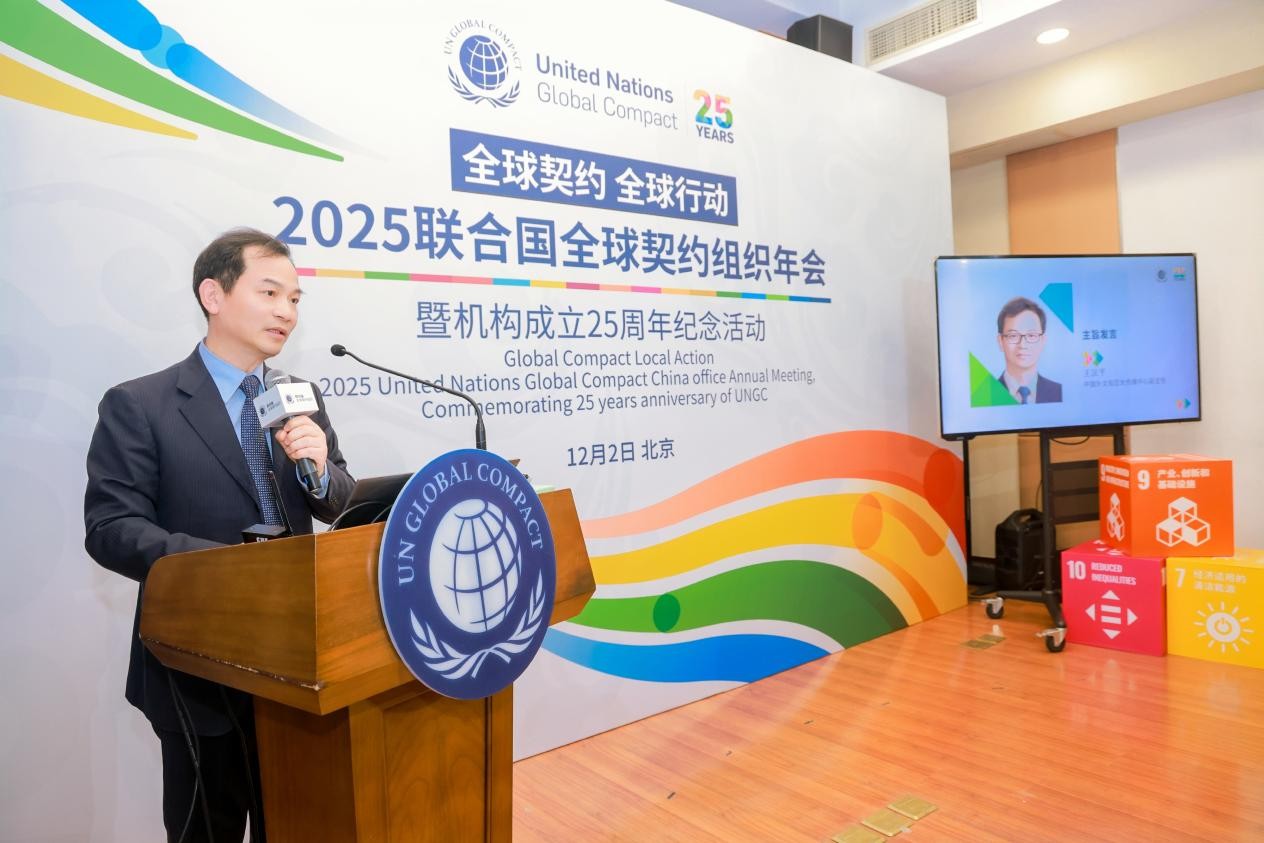 2025年12月2日,由联合国全球契约组织在华联络办公室主办的“全球契约 全球行动:2025联合国全球契约组织年会暨机构成立25周年纪念活动”在北京联合国驻华代表处隆重举行。本次盛会适逢联合国全球契约组织成立25周年的重要里程碑,汇聚了百余位来自中外领先企业的高管、权威专家学者及国际机构代表,旨在回顾推动商业向善的卓越历程,并携手擘画可持续发展未来的路径。