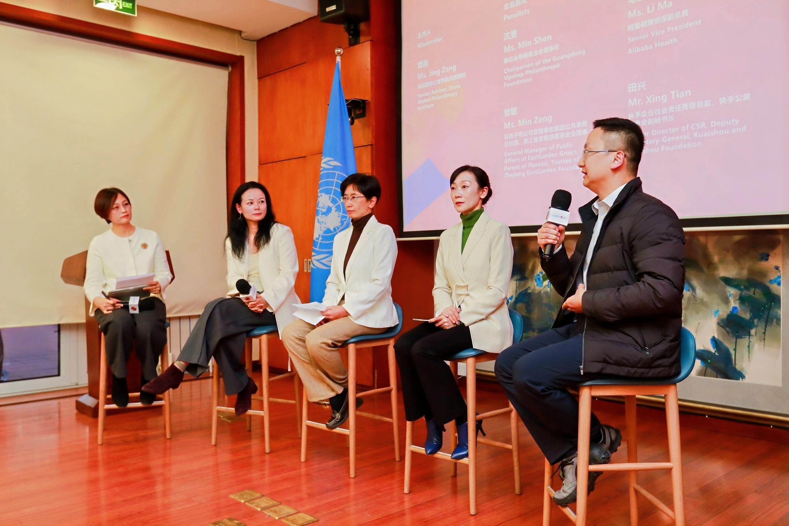 第三场圆桌对话由深圳国际公益学院高级顾问曾晶主持,唯品会慈善基金会理事长沈旻、阿里健康资深副总裁马立、花西子母公司宜格美妆集团曾敏、快手企业社会责任高级总监田兴参与讨论。沈旻介绍唯品会“唯爱妈妈”项目,通过7×14小时热线、法律心理支持、小程序资源对接,服务超2200万单亲家庭;马立分享阿里健康以“公益的心态、商业的手法、技术的力量”,推动HPV疫苗公益捐赠与科普,并通过C2M模式解决罕见病“柠檬宝宝”的特殊奶粉供应难题,开发饮食计算器减轻妈妈照护压力;曾敏介绍花西子女性公益守护热线,通过5500万个快递箱等多元渠道触达数亿人次,累计守护上万名女性心理健康;田兴分享快手“她力量”乡村振兴计划,培养上万名女性乡村主播,通过短视频直播赋能农村留守妇女增收致富。嘉宾们还围绕女性隐性需求洞察、跨界资源共享等话题展开互动,达成联合行动共识。