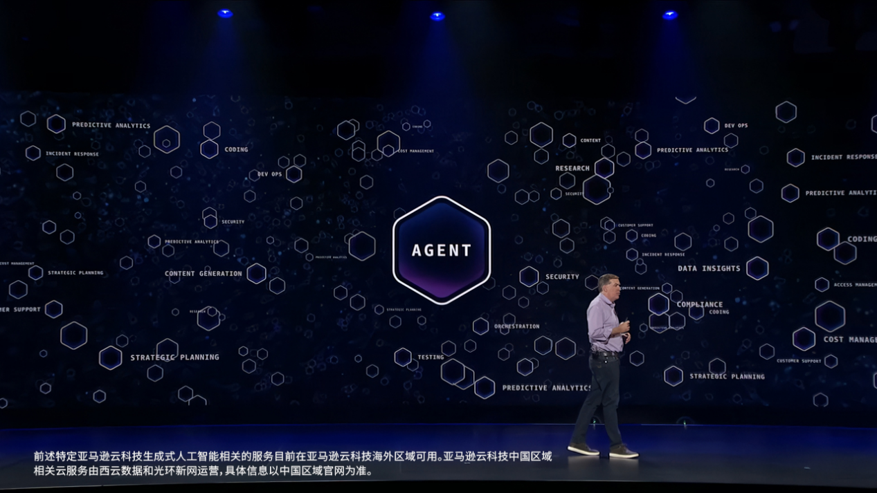 如果说芯片与模型是AI生态的基础设施,那么AI Agent就是激活商业价值的关键抓手。Garman 强调,前沿Agent必须具备三大特征:自主决策、横向扩展、长时运行——这意味着它们不再是被动响应的聊天机器人,而是能主动完成端到端任务的“数字员工”。