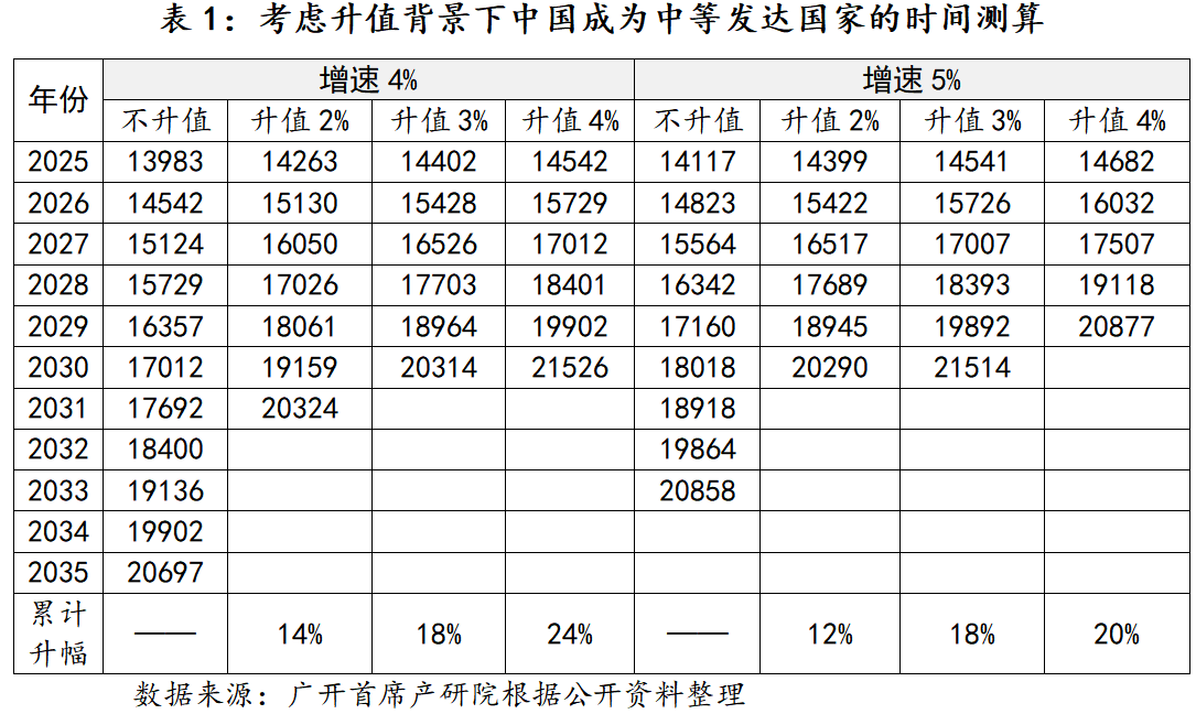 首先是有助于确保2035年远景目标顺利实现。“十五五”规划建议明确,到2035年中国将实现“人均国内生产总值达到中等发达国家水平”这一远景目标。这意味着人均GDP至少应为2万美元,以年均4%~5%的增速测算,中国要到2033~2035年前后才能跨越这一门槛。