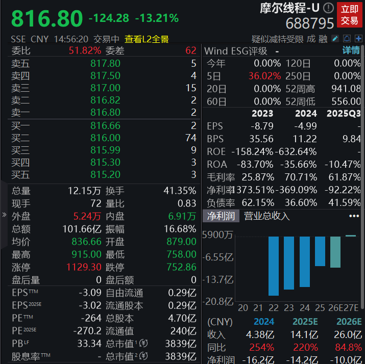 14:56 摩尔线程-U成交额达100亿元,现跌超13%。