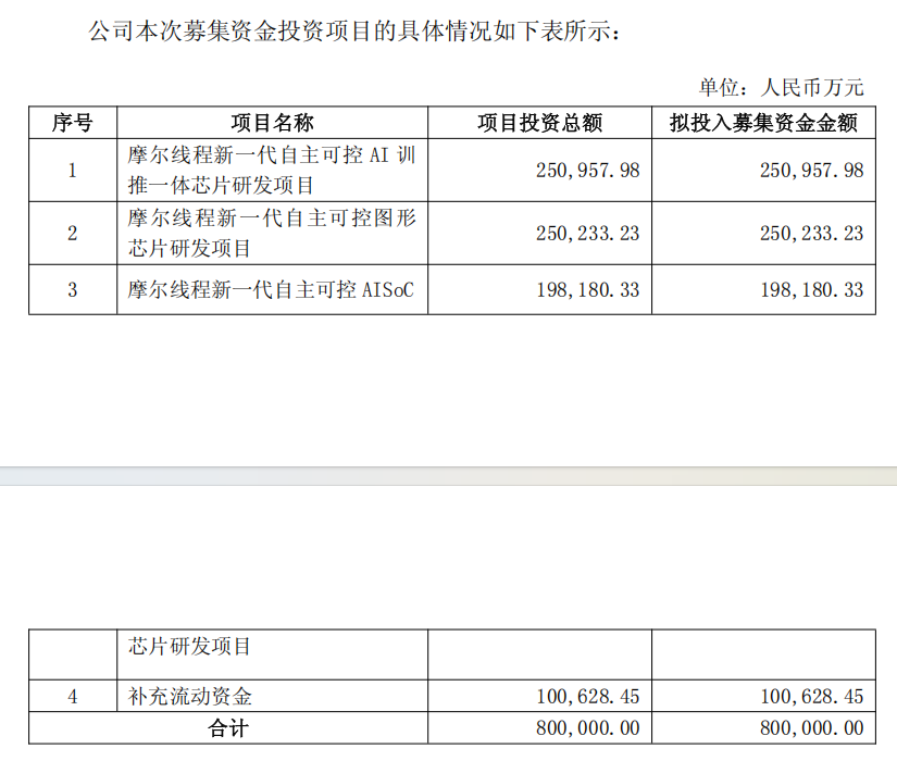 未扣除发行费用前,摩尔线程首次公开发行人民币普通股募集资金总额80亿元,这80亿元募资资金拟分配到3个研发项目并用于补充流动资金。3个研发项目分别是摩尔线程新一代自主可控AI训推一体芯片研发项目、新一代自主可控图形芯片研发项目、新一代自主可控AISoC芯片研发项目,分别拟投入募集资金约25.1亿元、25亿元、19.8亿元,另有10亿元拟用于补充流动资金。