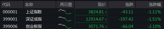 截至收盘,沪指跌1.11%,深成指跌1.51%,创业板指跌2.1%。