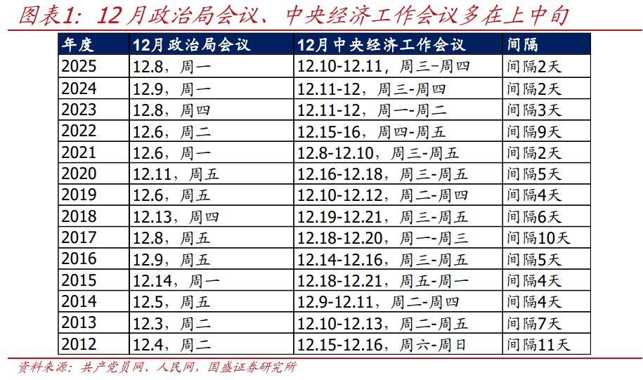 此外,本次政治局会议后时隔2天便召开中央经济工作会议,基本属过往最快节奏(同2021年、2024年)。时点看,过去5年12月两大会议平均间隔了4天左右,最快2天后、最慢9天后,本次可谓彰显了中央稳经济、稳预期的决心,2026年政策大基调和总体部署也就此确定。