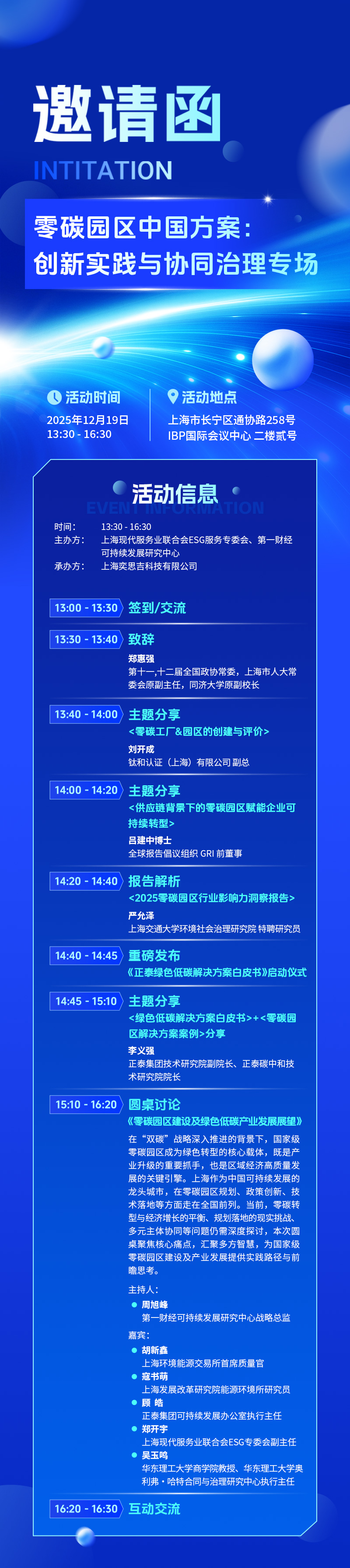 “为助力企业打造对接国家标准的零碳园区落地,由上海现代服务业联合会ESG专委会,第一财经联合主办的零碳园区中国方案:创新实践与协同治理专场将于2025年12月19日在上海IBP国际会议中心举行。