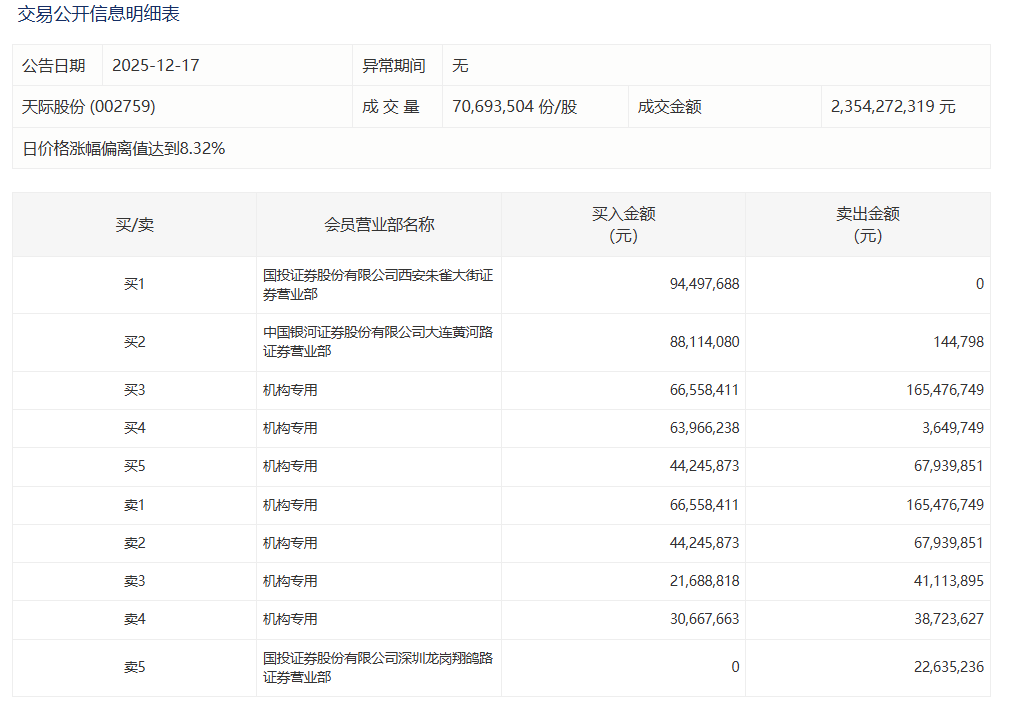天际股份今日涨停,成交额23.54亿元,换手率14.11%。盘后龙虎榜数据显示,1家机构专用席位净买入6031.65万元,有4家机构专用席位净卖出1.50亿元。国投证券股份有限公司西安朱雀大街证券营业部净买入9449万元,陈小群席位净买入8796万元。