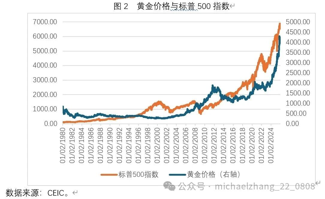 长期以来,黄金被视为一种避险资产。这意味着,在大多数情况下,黄金价格走势应该与主流风险资产走势不相关或者负相关。如图2所示,在历史上,黄金价格走势与美股指数走势之间的确存在较为明显的负相关。然而,自2022年第四季度至今,无论标普500指数还是黄金价格都出现了持续显著的上涨。在这一期间内,标普500指数翻番,黄金涨幅甚至超过了标普500指数。对这一现象较为合理的解释,是在全球经济与政治风险明显上升的背景下,美股依然走出了相对独立的牛市行情。问题在于,未来美股与黄金是否还能集体上涨?如果两者重新出现背离,是美股先调整,还是黄金先调整?