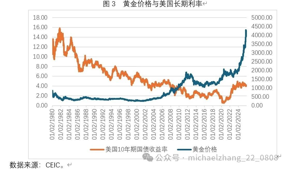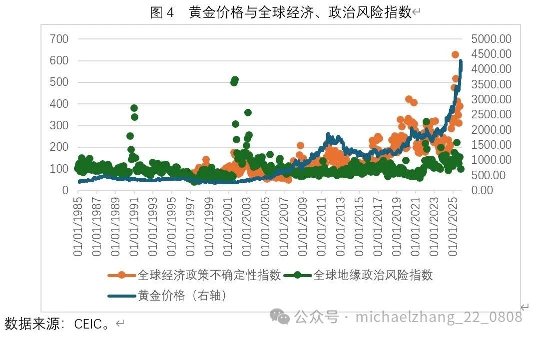 作为一种避险资产,黄金价格走势应该与刻画全球经济风险、全球地缘政治风险的指数走势之间呈现明显的正相关。如图4所示,不难看出,黄金价格走势与全球经济政策不确定性指数走势之间的正相关,要明显强于黄金价格走势与全球地缘政治风险指数走势之间的正相关。在2025年4月特朗普政府推出“对等关税”之后,全球经济政策不确定性指数上升至628的历史性峰值,可以显著拟合黄金价格的上涨。