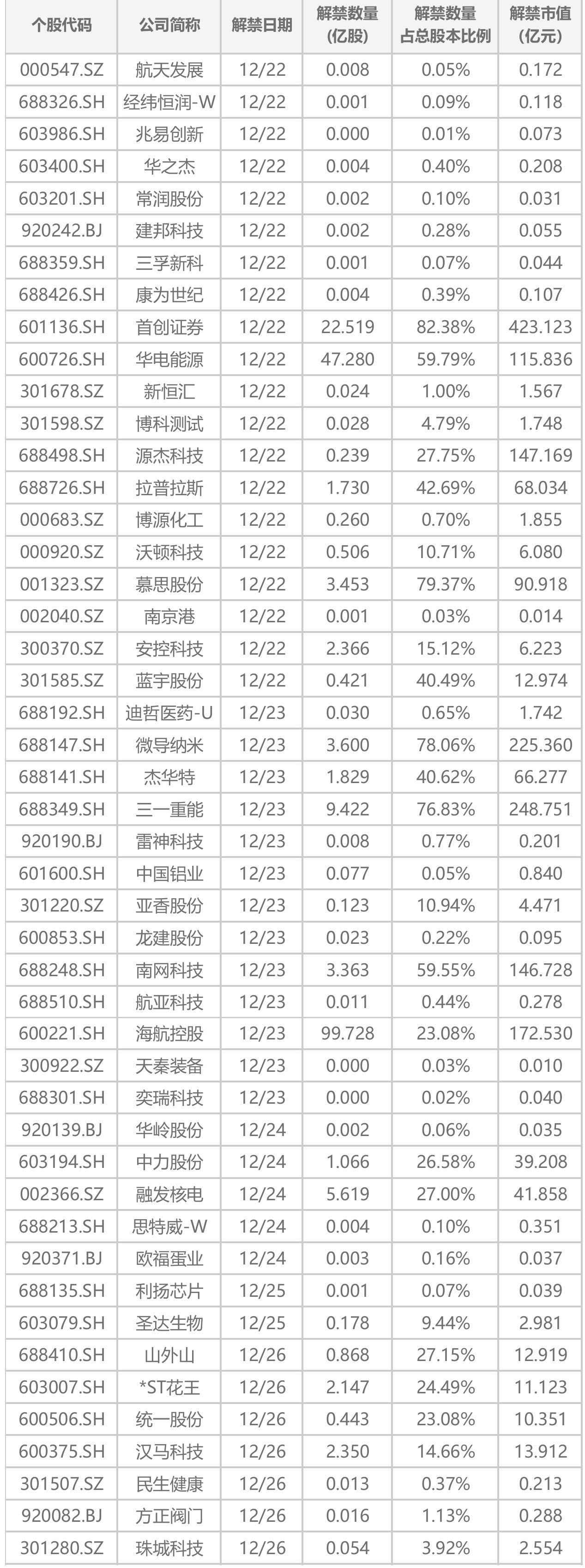 Wind数据统计显示,本周(12月22日-12月26日)共有47只限售股解禁,按最新收盘价计算,解禁总市值近1900亿元。17只个股解禁市值超10亿元,7股解禁市值超百亿元,其中首创证券、三一重能、微导纳米解禁市值居前,分别为423.12亿元、248.75亿元、225.36亿元。