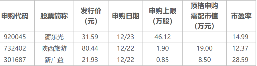 Wind数据显示,本周将有3只新股发行,其中,沪市主板1只,创业板1只,北交所1只。具体来看,12月22日发行的是陕西旅游、新广益;12月23日发行的是蘅东光。