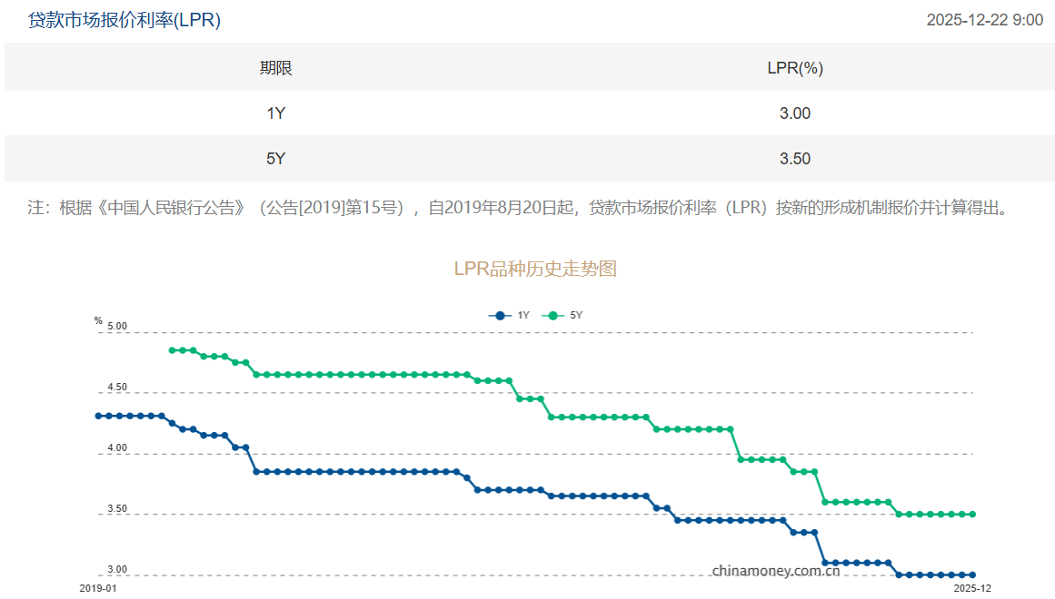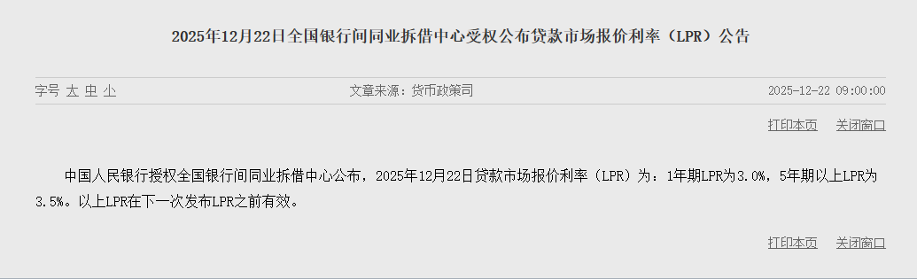 中国人民银行授权全国银行间同业拆借中心公布,2025年12月22日贷款市场报价利率(LPR)为:1年期LPR为3.0%,5年期以上LPR为3.5%。以上LPR在下一次发布LPR之前有效。