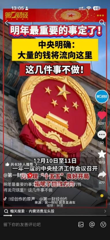 专业与大众的兼顾。财经媒体的受众具有明显的分层特征。微信平台的深度文章,通过翔实的数据分析、权威的专家解读,为专业人士提供决策参考;短视频平台的内容,则采用通俗化的语言、可视化的呈现,让普通用户也能看得懂、记得住。比如《明年最重要的事定了!中央明确:大量的钱将流向这里!这几件事不做》这一短视频,用接地气的标题和生动的讲解方式,将扩大内需这一宏观政策转化为普通人能够理解的具体信息,因而收到很好的传播效果,播放量达到1290万。