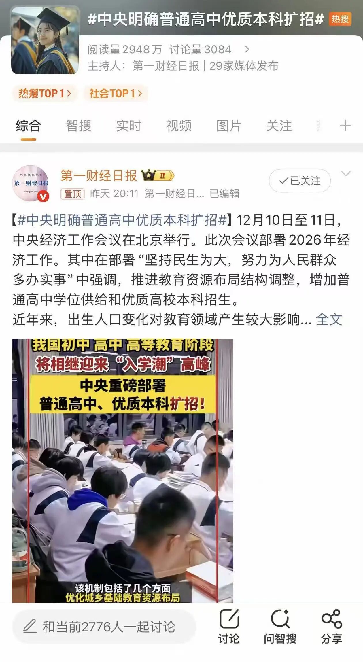 民生维度:找到传播爆点。重大会议报道要实现广泛传播,必须找到政策与民生的结合点。“中央明确普通高中优质本科扩招”话题冲上热搜总榜第一,正是因为精准击中了大众对教育问题的高度关切。微信文章《中央定调明年继续“国补”》聚焦消费品以旧换新政策的延续,单篇流量达到390万,成为单篇转发破10万的爆款。短视频《中央首提“制定实施城乡居民增收计划”,让老百姓“有钱花、敢花钱”》和《事关2亿人!中央支持灵活就业人员参加职工保险》 等均获得数百万次观看量。从会议内容中筛选与普通民众切身相关的政策点,用接地气的语言转化为话题和标题,这成为专业内容做出大流量的成功秘诀。