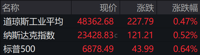 当地时间周一,美股三大股指上扬,道指涨超200点。截至收盘,道指涨0.47%,纳指涨0.52%,标普500指数涨0.64%。