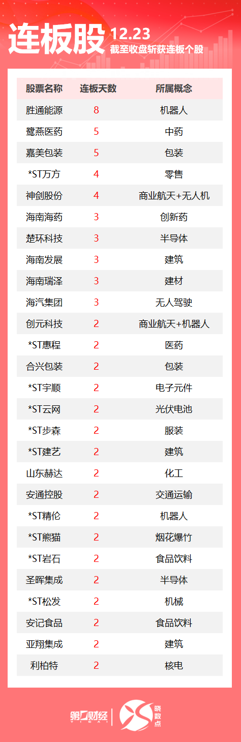 12月23日,Wind数据显示,A股市场共计68只个股涨停。其中机器人板块胜通能源8连板,医药板块鹭燕医药5连板。一图速览今日连板股>>