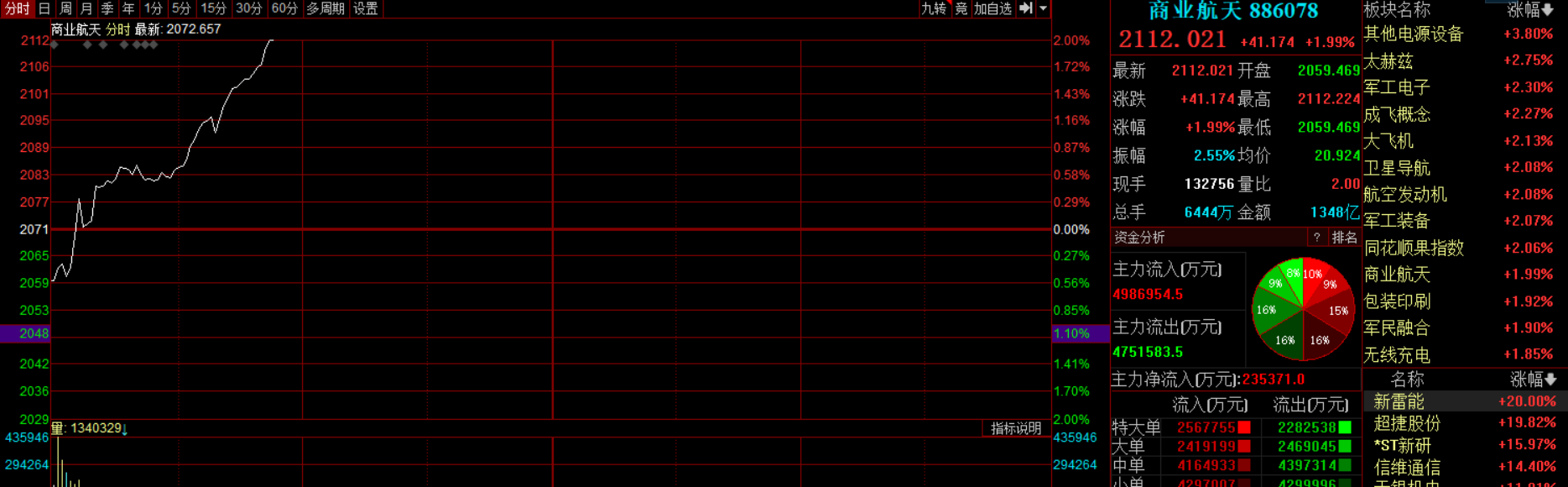 10:20 商业航天概念盘中持续拉升,中超控股、直线涨停,此前神剑股份5连板,新雷能、隆基机械、再升科技等多股涨停,超捷股份、天银机电、信维通信均涨超10%。