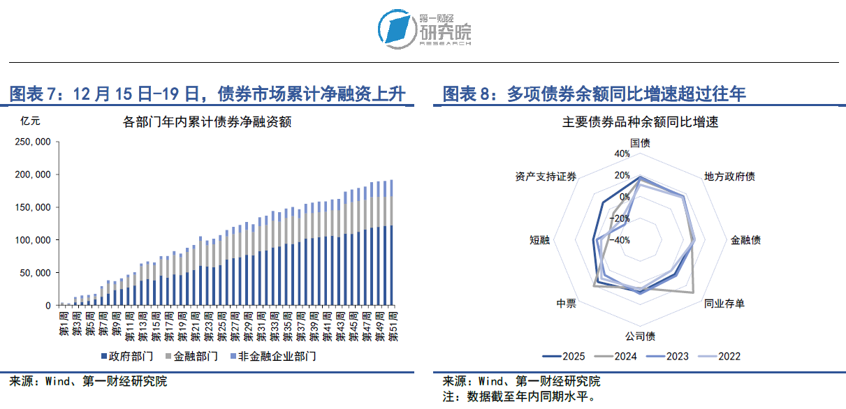 从债券余额增速来看,今年多项债券余额同比增速超过往年同期。截至12月19日,政府部门债券余额同比增速为16.5%,较2024年同期上升0.3个百分点;金融部门债券余额同比增速为8%,较2024年同期下降5.8个百分点;非金融企业部门债券余额同比增速为7.8%,较2024年同期增速上升2.9个百分点。