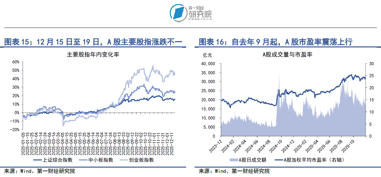 上周,A股成交量和市盈率同步回落。在12月15日至12月19日当周,A股日均成交量约为1.74万亿元,较前一周下降10.1%;市盈率为23.99,较前一周下降1.4%。从A股的杠杆情况来看,截至12月19日,A股融资融券余额达到2.5万亿元,融资余额占总市值的比重为2.36%。