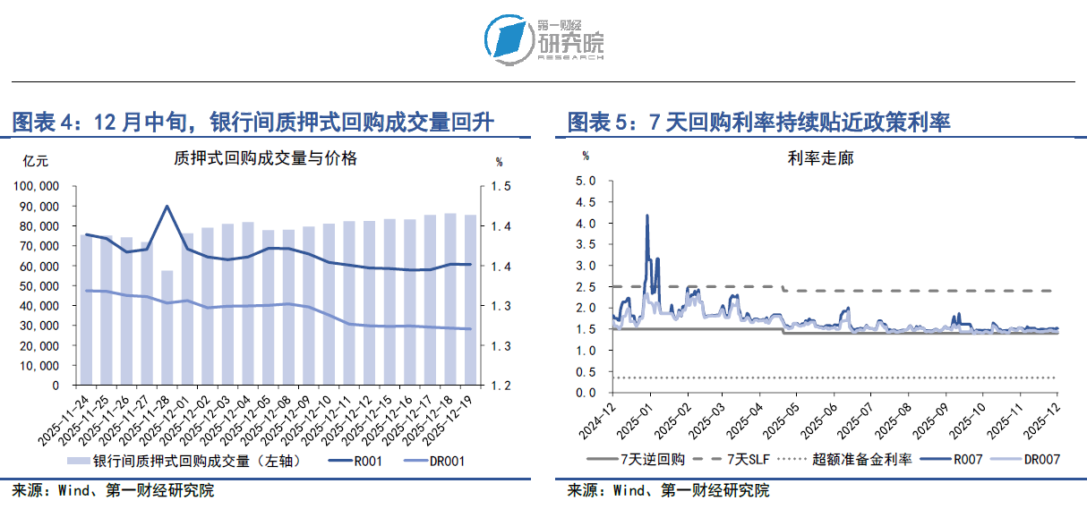 在12月15日至12月19日当周,银行间市场资金面基本保持稳定充裕。从成交量来看,上周银行间市场质押式回购成交量均值为8.48万亿元,较前一周上升4041.81亿元。
