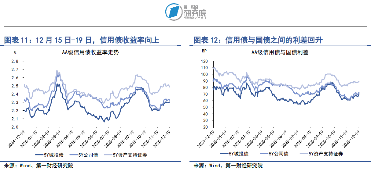 在12月15日至12月19日当周,多数品种信用债收益率下降。在AAA级债券中,5年期城投债收益率上升1.47BP,5年期公司债和资产支持证券收益率分别下降0.15BP和0.18BP。在AA级债券中,5年期城投债、公司债和资产支持证券收益率分别下降0.17BP、0.32BP和0.1BP。