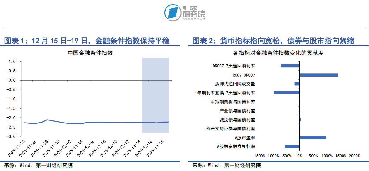 在2025年12月15日至12月19日当周,第一财经研究院中国金融条件日度指数均值为-2.25,与前一周持平。从年内来看,指数下降0.87。从指数的成分指标来看,上周货币指标指向宽松,债券与股市指标指向紧缩。从货币指标来看,央行持续保持稳定的货币投放,银行间市场资金面平稳有序。从债券市场来看,利率债与信用债收益率同步下降,信用利差小幅扩张。从股市指标来看,A股市盈率与成交量同步回落。