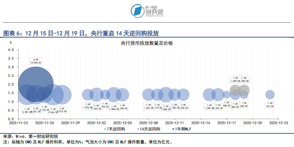 在12月15日至12月19日的当周,央行共通过7天逆回购投放资金4575亿元,同时为了应对跨年资金需求上升的情况,央行通过14天逆回购投放2000亿元,周内累计投放短期流动性6575亿元,基本与逆回购到期金额持平,央行保持稳定有序的流动性投放节奏。
