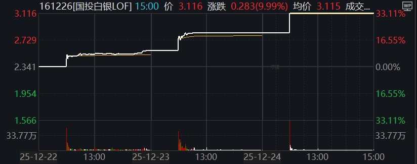 国投白银LOF公告,本基金二级市场的收盘价为3.116元,明显高于基金份额净值,投资者如果盲目投资于高溢价率的基金份额,可能面临较大损失。本基金将于2025年12月25日开市起至当日10:30停牌,自2025年12月25日10:30复牌。目前,本基金A类基金份额申购金额上限为500.00元。后续,本基金管理人将调整A类基金份额申购限额,本基金二级市场价格的高溢价率不具备可持续性,敬请特别关注。(注:国投白银LOF是全市场唯一一只主要投资于白银期货的基金产品。)