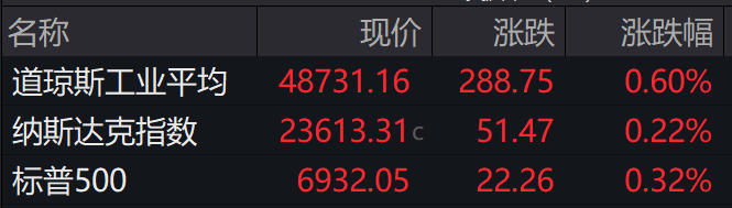 当地时间周三,美股三大股指齐升,道指涨近300点。截至收盘,道指涨0.60%,纳指涨0.22%,标普500指数涨0.32%。道指与标普500指数双双刷新收盘历史纪录。