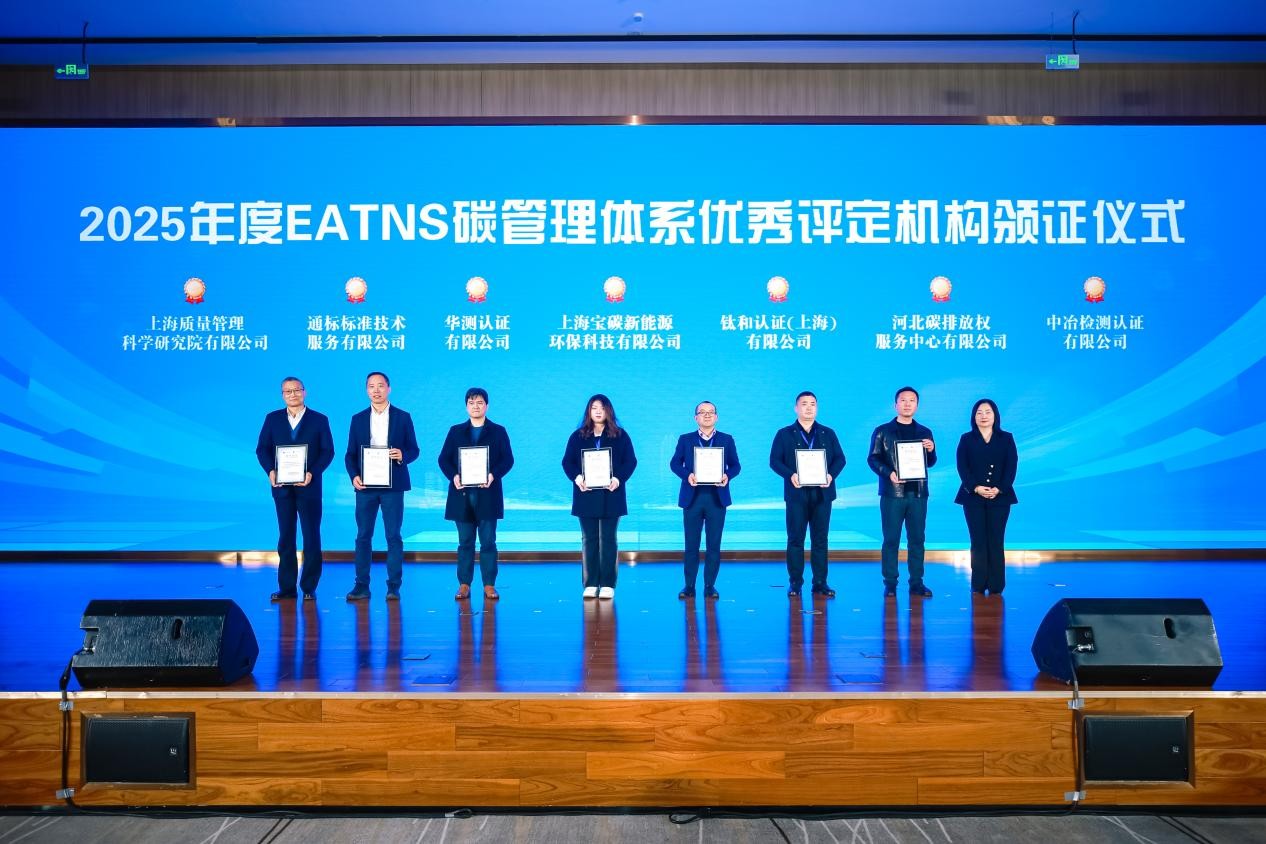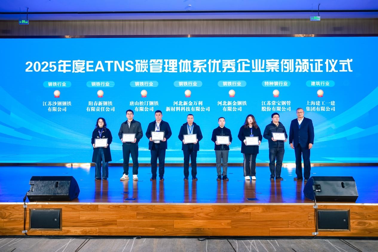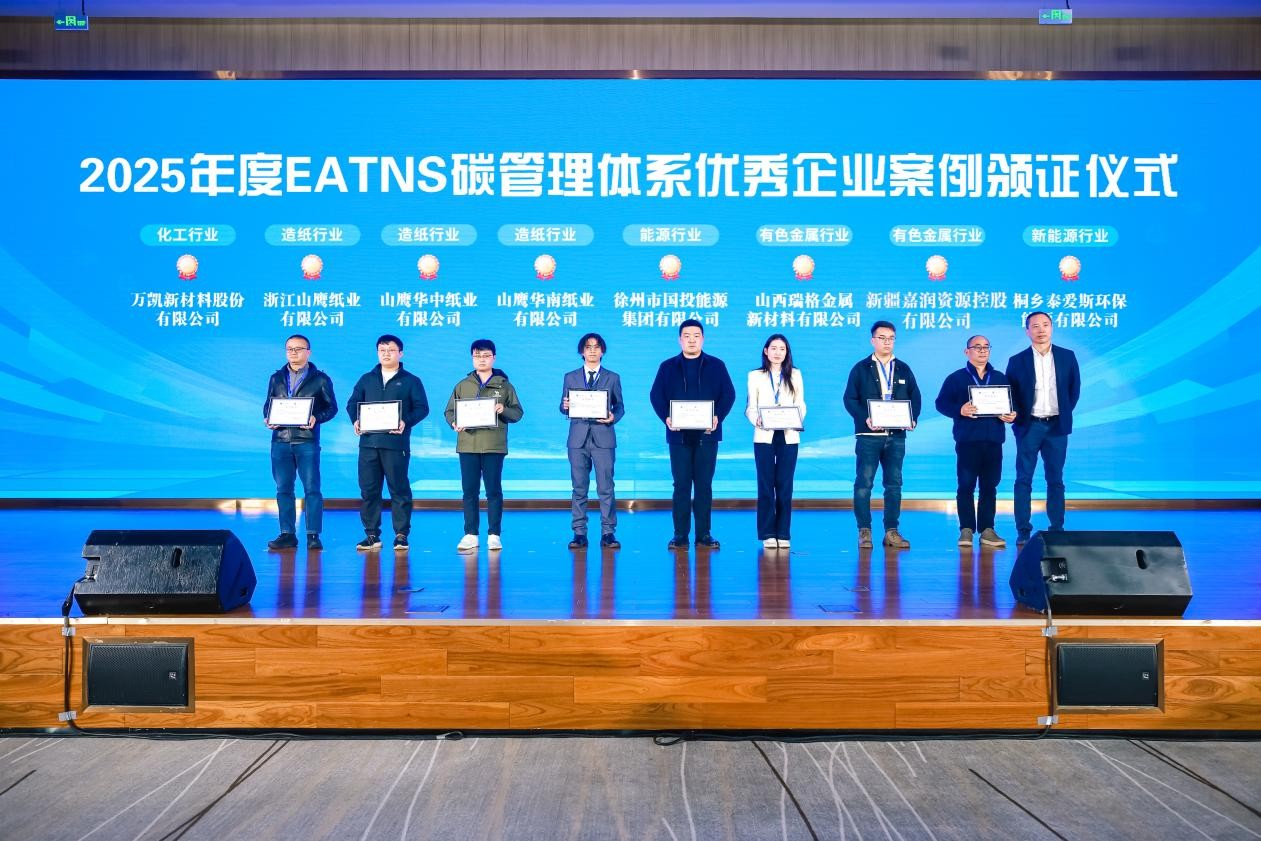 EATNS碳管理体系颁证仪式上,7家机构获评2025年度EATNS碳管理体系优秀评定机构,徐鸣一为机构代表颁发证书。15家企业荣获2025年度EATNS碳管理体系优秀企业案例奖,覆盖钢铁、建筑、化工、造纸、能源、有色金属、新能源等行业。